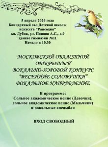 Вокальное направление Московского областного открытого Вокально-хорового конкурса «Весенние соловушки» состоится 5 апреля (воскресение) 2026 года в Концертном зале МБУДО «ДШИ «Рапсодия», г.о. Дубна, ул. Попова, д.9
